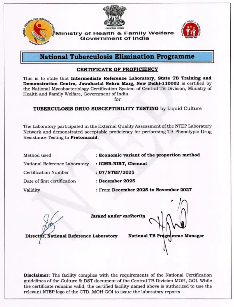 New Delhi TB Centre Lab Gets Certificate of proficiency for new drugs DST bedaquiline and Pretonamidex